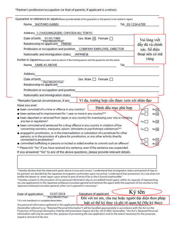 *Những thông tin phần cuối mẫu xin visa mà bạn cần biết:Mục "Have you ever"- Been convicted of a crime or offence in any country? Đã có tiền án/tiền sự ở quốc gia nào chưa?- Been sentenced to imprisonment for 1 year or more in any country? Có bị đi tù nhiều hơn một năm ở bất kỳ quốc gia nào?- Been deported or removed from Japan or any country for overstaying your visa or violating any law or regulation?Đã bị trục xuất khỏi Nhật hay bất kỳ quốc gia nào do quá hạ visa hay không chấp hành luật pháp?- Been convicted and sentenced for a drug offence in any country in violation of law concerning narcotics, marijuana, opium, stimulants or psychotropic substances?** Có từng bị phạt vì vi phạm sử dụng, trao đổi, mua bán các thuốc gây nghiện/chất gây kích thích như narcotics, marijuana, opium....- Engaged in prostitution, or in the intermediation or solicitation of a prostitute for other persons, or in the provision of a place for prostitution, or any other activity directly connected to prostitution? Đã có hành vi mại dâm hay trung gian mại dâm?- Committed trafficking in persons or incited or aided another to commit such an offence? **Đã có hành vi tiếp tay cho việc buôn người?