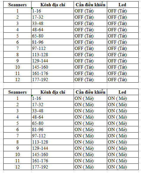 Lưu ý: với 12 Scanners ta có thể lưu được 12 đèn Beam hoặc led khác nhau, với mỗi thiết bị ta làm tương tự như thiết bị đầu tiên.