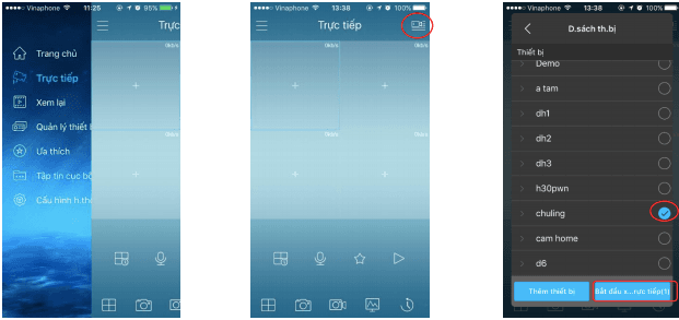 Bước 1: Chọn Biểu tượng Menu -> Chọn “Trực tiếp” -> Chọn biểu tượng thiết bị ở góc trên bên phải màn hình -> Stick chọn vào thiết bị và kênh muốn xem -> Bắt đầu xem trực tiếp