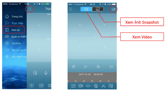 Bước 1: Chọn biểu tượng Menu -> Chọn “Xem lại” -> Chọn biểu tượng thiết bị góc trên bên phải.