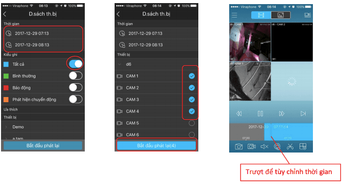 Bước 2: Chọn thời gian cần xem -> Chọn kiểu ghi hình (thường để “Tất cả”) -> Kéo xuống chọn thiết bị và kênh cần xem lại -> Bắt đầu phát lại