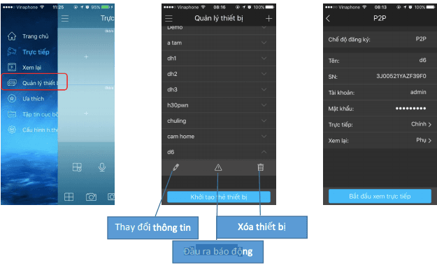 Nếu quý khách đã thêm thiết bị và muốn thay đổi thông tin thiết bị thì đây là nơi để làm điều đó. Quý khách có thể thay đổi tên thiết bị, tài khoản, mật khẩu, dòng truyền, thiết lập báo động đầu ra hoặc xóa thiết bị. Ví dụ bạn thay đổi mật khẩu trên đầu ghi thì ở đây quý khách cũng sẽ phải thay đổi mật khẩu để KBView Lite kết nối lại với thiết bịcủa quý khách.