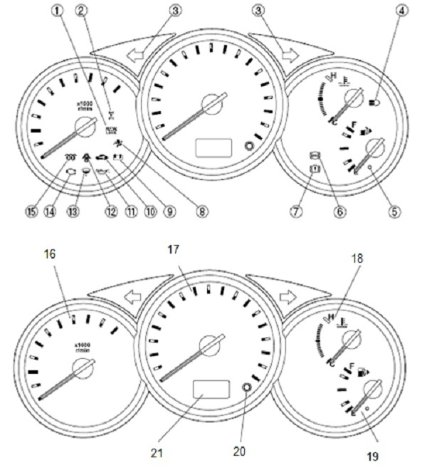 12 Đèn bỏo cửa 13 Đèn cảnh báo nhiên liệu có nước 14 Đèn MIL 15 Đèn cảnh báo hệ thống sấy (xụng) 16 Đồng hồ báo tốc độ động cơ 17 Đồng hồ báo tốc độ xe ô tô 18 Đồng hồ báo nhiệt độ nước 19 Đồng hồ báo mức nhiên liệu 20 Núm đ/c chức năng ở màn hình 21 Số Km đã đi / Km cho một chuyến