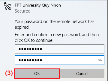 Hoặc nếu đăng nhập mạng wifi FPT University Quy Nhon (mạng wifi này có tại nhà Beta campus ĐH FPT Quy Nhơn) lần đầu tiên bằng máy tính dùng Windows 10 với password khởi tạo, hệ thống sẽ yêu cầu bạn đặt password mới, hãy nhập password mới (2 lần tại khung new password và confirm new password) để tạo password mới và đồng thời kích hoạt tài khoản.