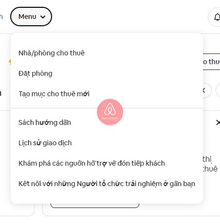 Bước 1: Các bạn truy cập vào https://www.airbnb.com/ , trên thanh công cụ, các bạn nhấn vào Menu, sau đó các bạn chọn Nhà/phòng cho thuê.