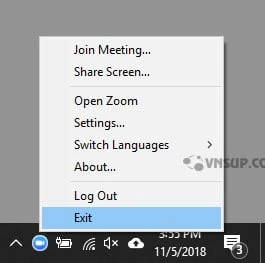 - Để thoát hoàn toàn ứng dụng zoom, nhấp chuột phải vào biểu tượng zoom trong khay hệ thống (góc dưới bên phải) và nhấp Exit.