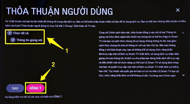 Bước 3: Tích vào 2 ô là "Chọn tất cả" và "Thông tin giọng nói" (1), sau đó nhấn vào chữ "ĐỒNG Ý"/"YES".
