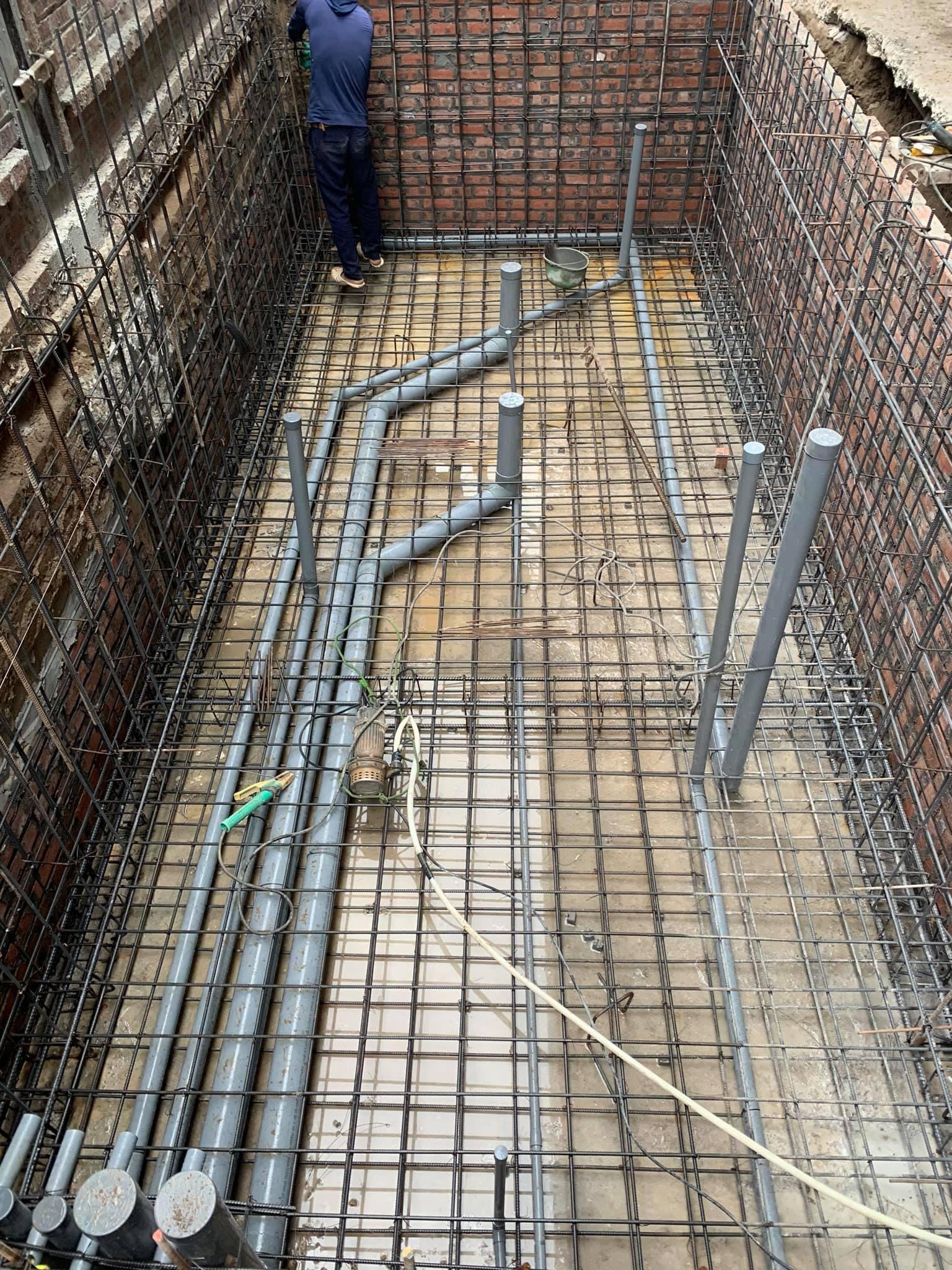 Tiếp theo bạn đổ betong đáy bằng mặt của ống hút sàn (hút đáy). Lưu ý bạn nên đổ tạo dốc từ thành bể về hố lọc sàn để phân cá và cặn bể sẽ trôi về đó hiệu quả.