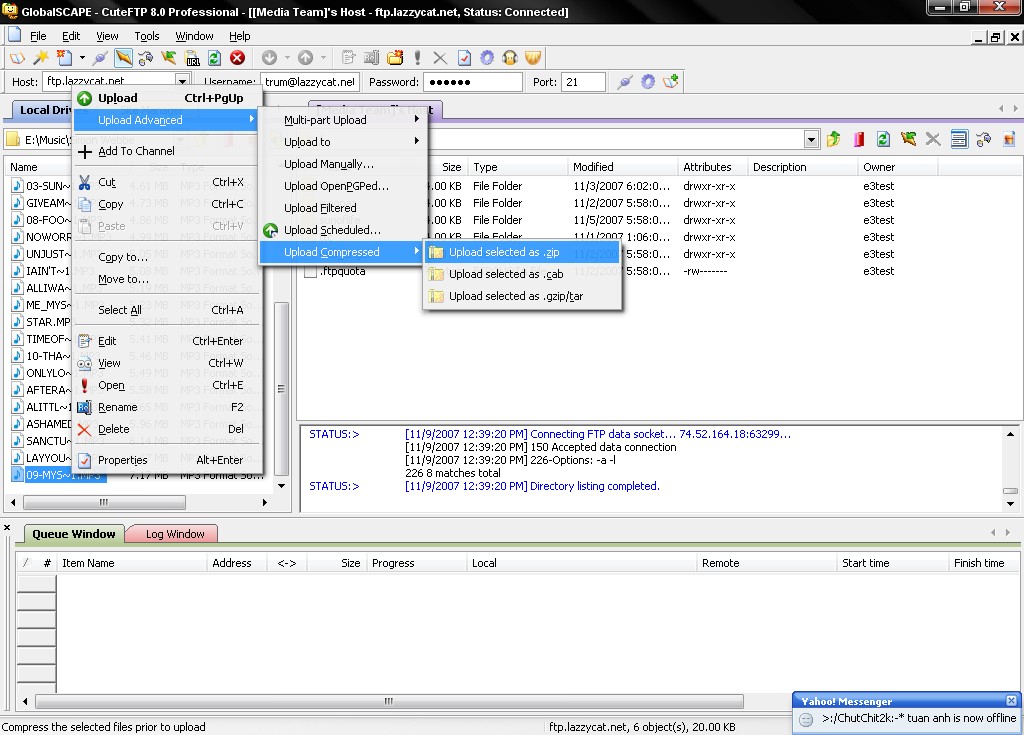 Nếu file bạn chọn quá nhiều , muốn CuteFTP tự nén thì chọn các file cần up, sau đó bấm chuột phải vào 1 trong số đó, chọn Upload Advanced => Upload Compressed => Upload Selected.
