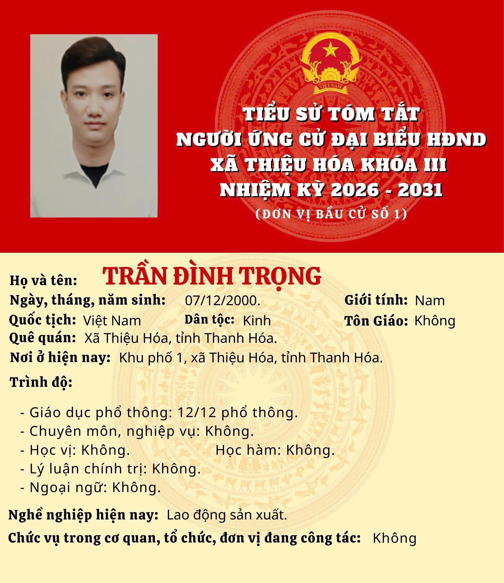Tóm tắt tiểu sử ông Hoàng Văn Hưng, ứng cử viên Đại biểu HĐND xã Thiệu Hóa, nhiệm kỳ 2026- 2031 | |