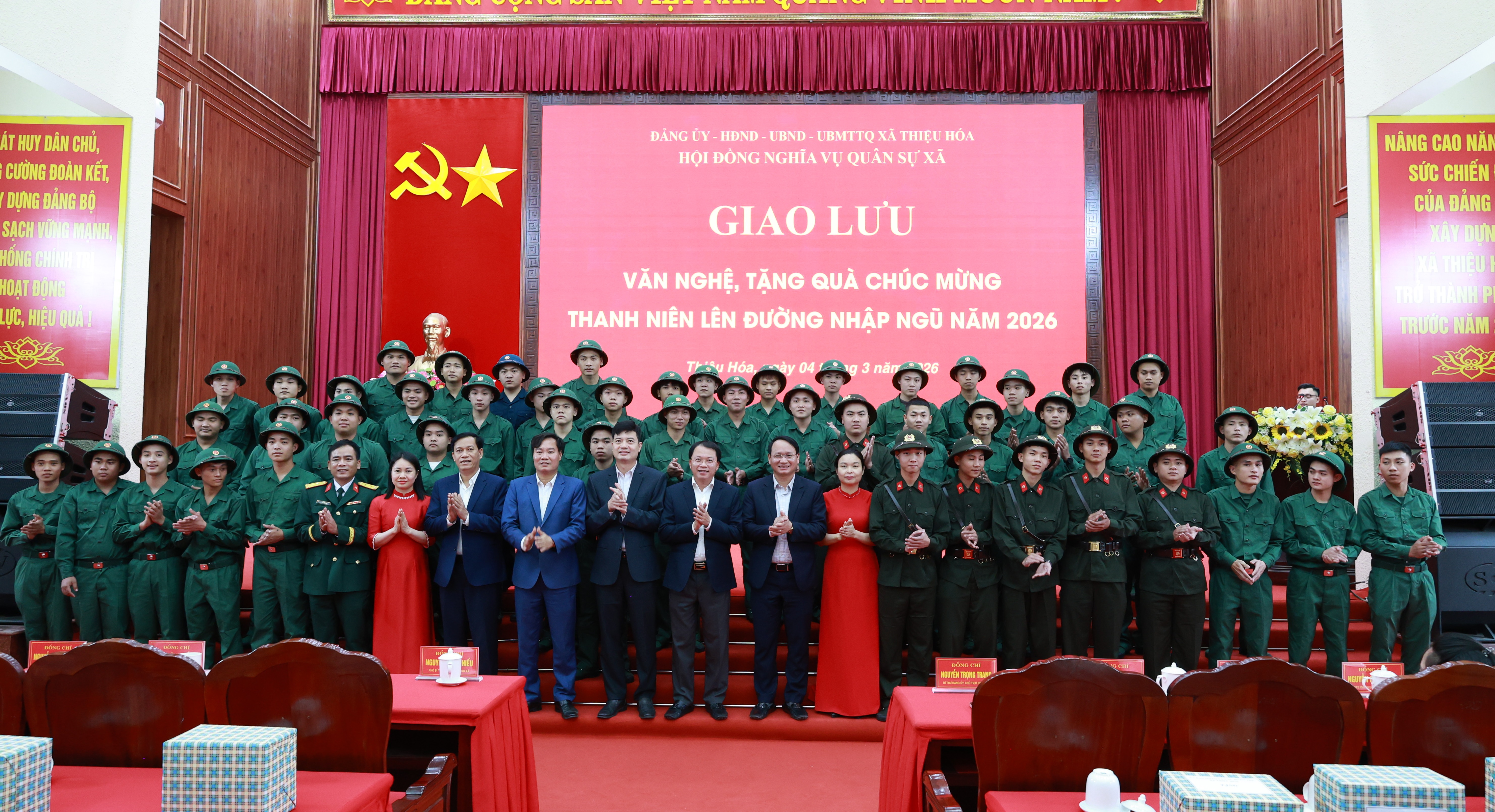 Ấm áp nghĩa tình buổi gặp mặt tân binh xã Thiệu Hóa năm 2026 Chiều 4/5/2026, trong không khí trang nghiêm và ấm áp nghĩa tình, Đảng ủy, HĐND, UBND, Ủy ban MTTQ xã Thiệu Hóa đã tổ chức gặp mặt công dân chuẩn bị nhập ngũ và thực hiện nghĩa vụ tham gia Công an nhân dân năm 2026. - Hội nghị tiếp xúc cử tri, vận động bầu cử HĐND xã khóa III tại đơn vị bầu cử số 4