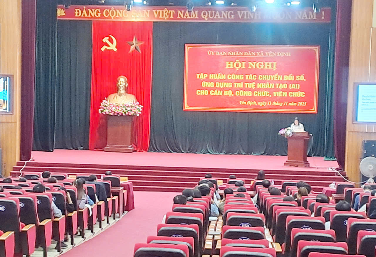 Ủy ban nhân dân xã Yên Định: Tổ chức hội nghị tập huấn chuyển đổi số ứng dụng trí tuệ nhân tạo (AI) cho cán bộ, công chức, viên chức. (12/11/2025) Thực hiện kế hoạch số 67, ngày 26/9/2025 của Ủy ban nhân dân xã về triển khai chương trình đào tạo, bồi dưỡng, tập huấn, phổ cập và nâng cao kiến thức khoa học công nghệ, đổi mới sáng tạo và chuyển đổi số trên địa bàn xã. Sáng 11/11/ 2025, Ủy ban nhân dân xã Yên Định tổ chức hội nghị tập huấn “Ứng dụng trí tuệ nhân tạo (AI) dành cho cán bộ, công chức, viên chức” trên địa bàn xã. -