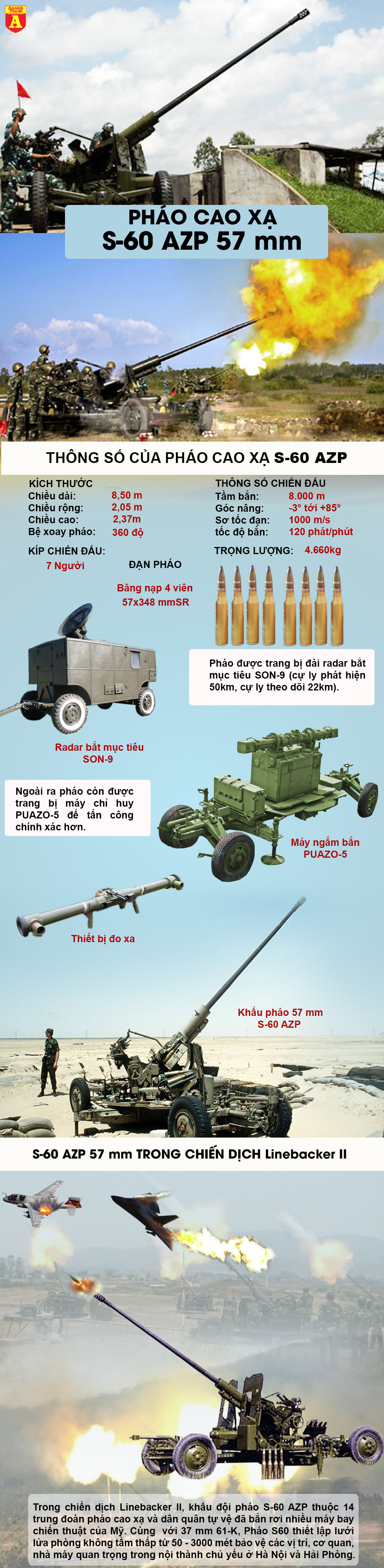 [Infographic] Khám phá loại pháo phòng không 57mm từng "víu cổ" máy bay Mỹ trên bầu trời Hà Nội Việt Hùng 24/12/2017 11:00 Facebook Twitter PrintANTD.VN - Pháo S60 cỡ nòng 57mm là một trong những loại pháo phòng không uy lực tại chiến trường Việt Nam. Cùng với pháo cao xạ cỡ nòng 37mm, loại pháo này đã từng bắn hạ nhiều máy bay Mỹ đặc biệt trên bầu trời Hà Nội.