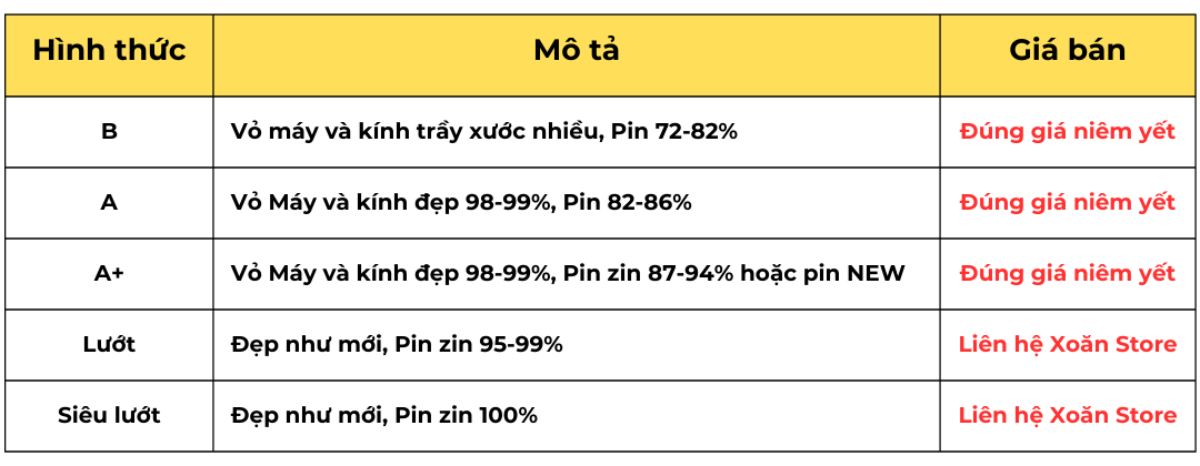 B: Vỏ máy và kính có trầy xước nhiều, Pin 72-82% A: Vỏ máy và Kính đẹp 98-99%, Pin 82-86% A+: Vỏ máy và Kính đẹp 98-99%, Pin zin 87-94% hoặc pin New Đen / B: Vỏ máy và kính có trầy xước nhiều, Pin 72-82% - 1.390.000₫ Đen / A: Vỏ máy và Kính đẹp 98-99%, Pin 82-86% - 1.890.000₫ Đen / A+: Vỏ máy và Kính đẹp 98-99%, Pin zin 87-94% hoặc pin New - 2.190.000₫ Trắng / B: Vỏ máy và kính có trầy xước nhiều, Pin 72-82% - 1.390.000₫ Trắng / A: Vỏ máy và Kính đẹp 98-99%, Pin 82-86% - 1.890.000₫ Trắng / A+: Vỏ máy và Kính đẹp 98-99%, Pin zin 87-94% hoặc pin New - 2.190.000₫ Vàng / B: Vỏ máy và kính có trầy xước nhiều, Pin 72-82% - 1.390.000₫ Vàng / A: Vỏ máy và Kính đẹp 98-99%, Pin 82-86% - 1.890.000₫ Vàng / A+: Vỏ máy và Kính đẹp 98-99%, Pin zin 87-94% hoặc pin New - 2.190.000₫ Hồng / B: Vỏ máy và kính có trầy xước nhiều, Pin 72-82% - 1.390.000₫ Hồng / A: Vỏ máy và Kính đẹp 98-99%, Pin 82-86% - 1.890.000₫ Hồng / A+: Vỏ máy và Kính đẹp 98-99%, Pin zin 87-94% hoặc pin New - 2.190.000₫ Còn hàngHÀNG SẴN GIAO NGAY