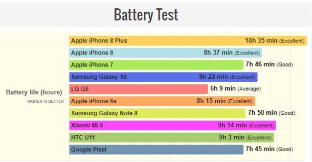 Thời gian sử dụng thực tế của của iPhone 8 Plus dẫn đầu trong các smartphone cao cấp hiện nay. Ảnh: Phonearena.