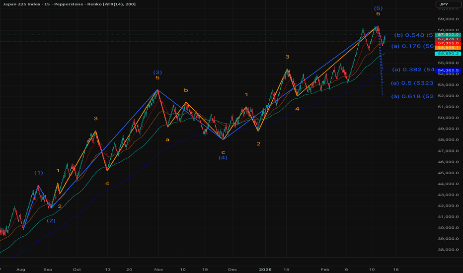 Japan 225 Index🔑 Key Levels Resistance (Short Zone): Channel top / current highs Target: 54,000 Invalidation: Daily close above channel resistance 📌 Trade Logic Short: Favorable risk-reward from channel resistance → target 54,000 Buy: Only valid after pullback and strong bullish reaction at support If priceby Jyoub_es221Nikkei 225 Retreats From Record HighNikkei 225 Retreats From Record High As the chart shows, the Nikkei 225 index reached a historic high near 58,500 points on Monday. Bullish sentiment was driven primarily by political developments. According to media reports, the rally followed the decisive victory of the Liberal Democratic Partyby FXOpen118Nikkei 225 4H: Flat Correction with Bullish Target 59,600【Nikkei 225 (JAPAN225CFD) - 4H Chart】 From the April low last year: Double Zigzag W-X-Y completed on November 4 → Large Flat correction A-B-C now in progress → Currently, from the November 21 low as the starting point: Inside the Flat B-wave Double Zigzag (w)-(x)-(y), likely in the (y) waLongby LIVERMORE333223JP225 - US Labor Data Props up Risk-on SentimentNarrative : JP politics are in favor of the stock market Sentiment : US Labor supports risk assets Pattern : TC(B) Time : NY OpeningLongby Cherry94221Japan 225 IndexKey Levels Resistance (Short Zone): Channel top / current highs Target: 54,000 Invalidation: Daily close above channel resistance 📌 Trade Logic Short: Favorable risk-reward from channel resistance → target 54,000 Buy: Only valid after pullback and strong bullish reaction at support If price bby Jyoub_es2JP225--SHORT--Short bias --Entry and tp levels are as shown on the chartShortby catalyts1#NIKKEI - 10,000 POINTS MOVE?Date: 01-02-2025 #Nikkei - Current Price: ₹ 48,674.00 Pivot Point: ₹ 50,886.50 Support: ₹ 48,859.48 Resistance: ₹ 52,931.34 Upside Levels: L1: ₹ 55,471.92 L2: ₹ 58,012.50 L3: ₹ 60,684.75 L4: ₹ 63,357.00 Downside Levels: L1: ₹ 46,309.99by Micro_trades123Updated 2Short ZoneBias: Bearish (fade the rally into resistance) Setup: Pure price-action channel play — no indicators. Short Entry Zone: Near channel upper boundary / recent highs (around current area after recent peak near 58,000+). Target: 54,000 (major downside objective, ~5–6% potential drop from today's levels)by Jyoub_esUpdated 1#Nikkei - 30,000 Points Move on Cards?Date: 12-02-2026 #Nikkei Pivot: 57,780.00 Support: 52,699.18 Resistance: 62,908.98 🔼 Upside Levels: L1: 69,976.49 | L2: 77,044.00 | L3: 84,268.00 | L4: 91,492.00 🔽 Downside Levels: L1: 45,607.59 | L2: 38,516.00 | L3: 31,292.00 | L4: 24,068.00 Watch reaction near pivot for trend direction. Planby Micro_trades1230Is there life in the old dog yet? Thoughts on Japan...Japan, once known for its high standard of living and expensive prices, has seen a dramatic shift. Today, Japan is often praised by travellers for its affordability, with the Yen weakened by decades of financial repression. While Japan's industrial and infrastructure standards remain high, its citizby ReallyMeUpdated 113