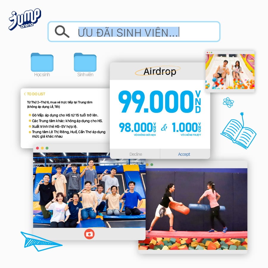 Đặt vé online nhanh chóng, tiện lợi, trải nghiệm khu vui chơi thể thao bạt nhún Jump Arena Trampoline Park lớn nhất Việt Nam trên toàn quốc.