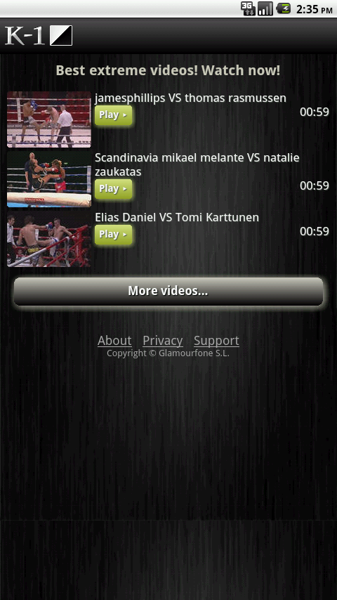 Want to see how some of the toughest people in the world make a living? This K1 Thai Boxing app comes to your Android device to bring you furious K1 Thai Boxing action. These men and women give it everything they've got to survive in the ring and come out victorious. If you're a fight fan of any kind, then this app is for you.Watch as top fighters from around the world compete in fearsome fighting. You'll find both popular fighters that have made their mark in the mainstream and even top tier fighters you've never heard of before. This app presents you with streaming video clips of fight highlights, usually about one minute in length.User Data Privacy