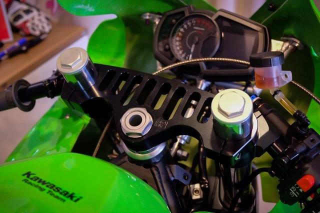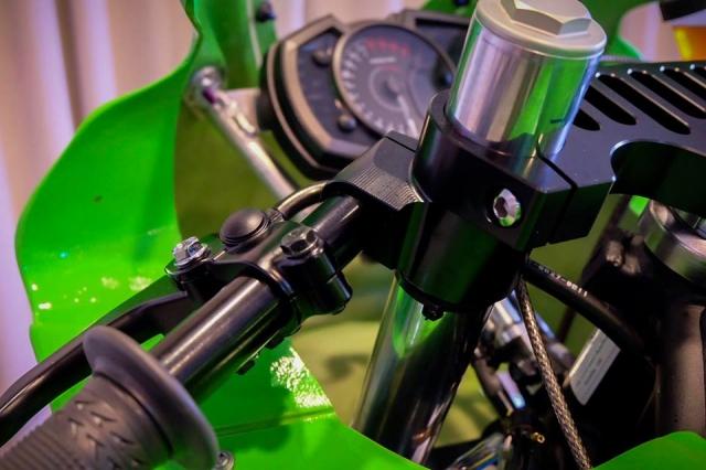 Đằng sau quây yếm thể thao là bộ trang bị chảng ba lái CNC kết hợp tay lái clip-on hạ thấp trọng tâm, đưa phần ty phuộc lên khá cao.