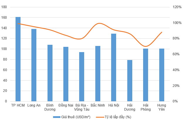 Giá thuê đất công nghiệp và tỷ lệ lấp đầy năm 2021. Đvt: USD/m²