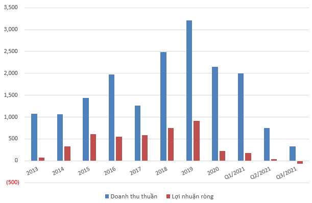 Doanh thu thuần và lợi nhuân ròng của KBC. Đvt: Tỷ đồng