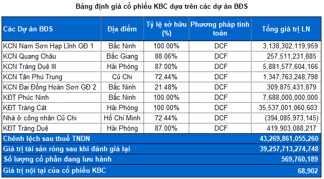 Người viết sử dụng phương pháp chiết khấu dòng tiền cho các dự án của KBC. Như vậy, giá trị hợp lý của KBC nằm ở mức 68,902 đồng. Giá thị trường vẫn còn ở mức khá hợp lý để mua vào cho mục tiêu đầu tư dài hạn.