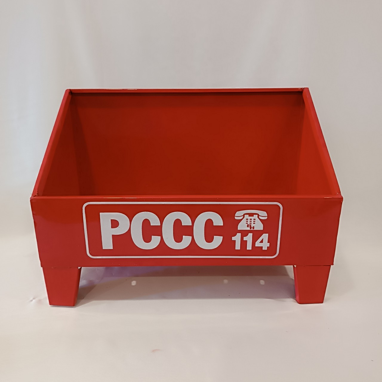 Mặt trước Kệ đựng 2 bình chữa cháy có dòng chữ “PCCC” và số điện thoại 114 – hotline cứu hỏa.