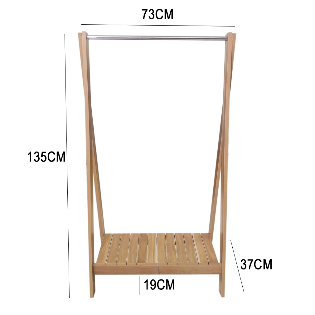 Với kích thước 135 x 73 x 37cm sử dụng kệ gỗ để quần áo chữ A khá tiện dụng không chiếm nhiều diện tích căn phòng.