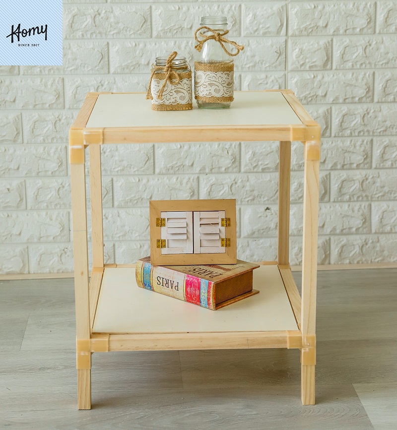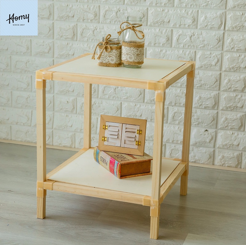 Kệ gỗ 2 tầng HOMY sử dụng gỗ thông có đường vân sáng, và mang màu sắc của màu gỗ tự nhiên