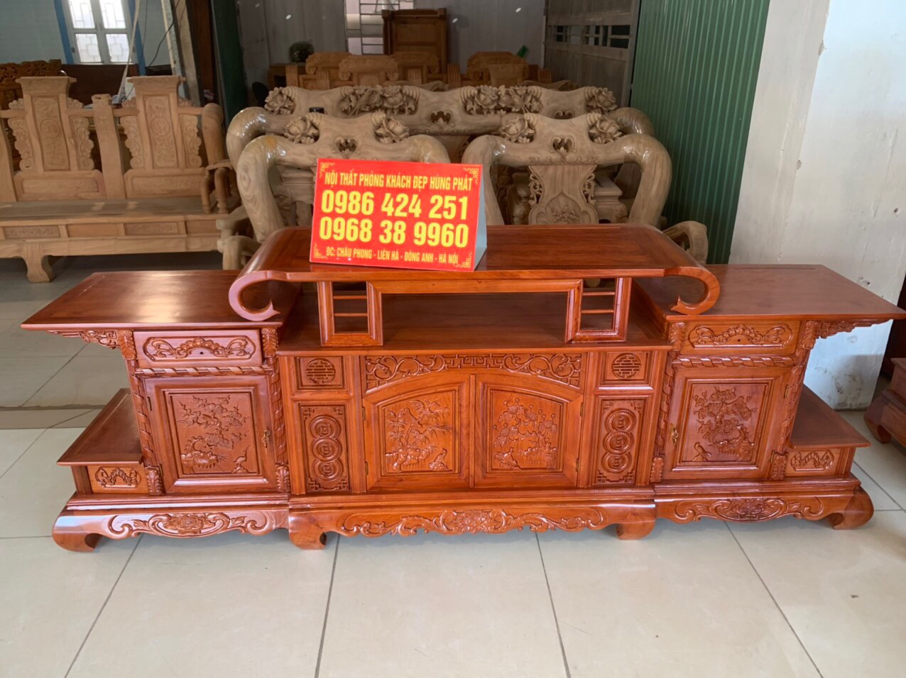 Kệ tivi Vòm gỗ hương đá đục tứ quý VIP khung 4 ván 2 đục sâu