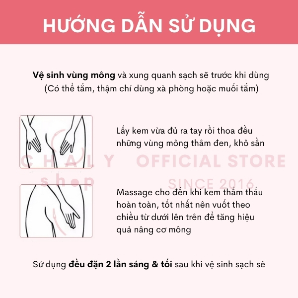 – Massage cho tới khi kem thẩm thấu hoàn toàn. Tốt nhất nên vuốt theo chiều từ dưới lên trên để tăng hiệu quả nâng cơ mông, cải thiện mông chảy xệ