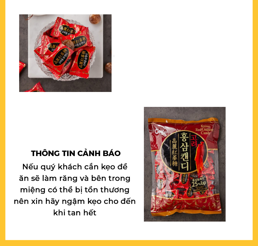 Xuất xứ: Hàn Quốc Khối lượng tịnh: 300 g/ bịch Thành phần: đường trắng, syrup, chiết xuất hồng sâm 0.5%, trà sâm 0.2%, hương liệu tổng hợp (L-mentol, hương thảo mộc), màu tổng hợp (màu caramen I ( INS – 150a)). Hướng dẫn sử dụng: Ngậm trực tiếp. Bảo quản: nơi thoáng mát, tránh ánh sáng mặt trời chiếu trực tiếp Ngày sản xuất: 18 tháng trước hạn sử dụng Hạn sử dụng: Ghi trên bao bì (năm / tháng / ngày) Thông tin cảnh báo: nếu quý khách cắn kẹo để ăn sẽ làm răng và bên trong miệng có thể bị tổn thương nên xin hãy ngậm kẹo cho đến khi tan hết.