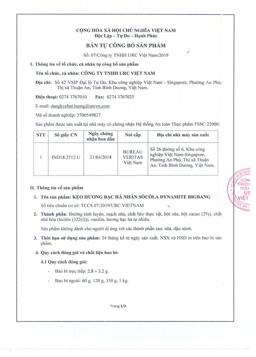 Công bố sản phẩm KẸO HƯƠNG BẠC HÀ NHÂN SÔCÔLA DYNAMITE BIGBANG 12/08/2019