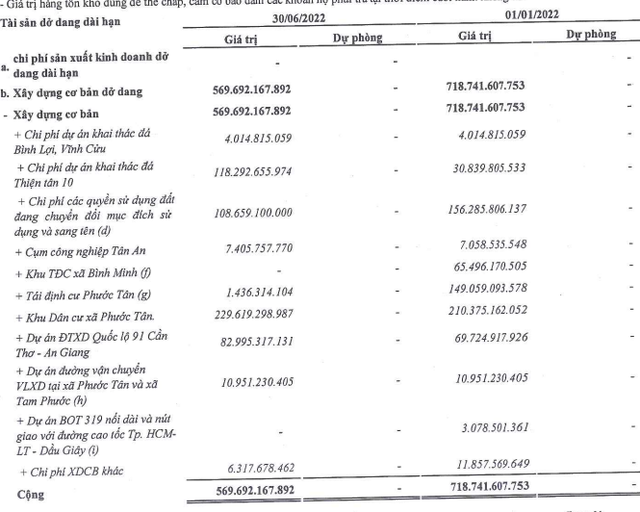 Trong kỳ, tài sản dở dang dài hạn giảm 20,7% so với đầu năm, tương ứng giảm 149 tỷ đồng về 569,7 tỷ đồng. Trong đó, chủ yếu 229,6 tỷ đồng dự án Khu Dân cư xã Phước Tân; 118,3 tỷ đồng chi phí dự án khai thác đá Thiện Tân 10; 108,7 tỷ đồng dự án chi phí các quyền sử dụng đất đang chuyển đổi mục đích sử dụng và sang tên…