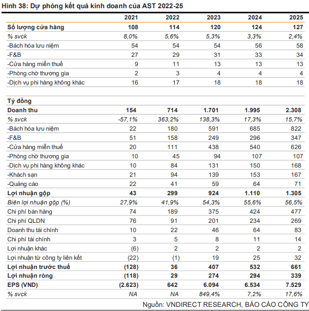 Đối với mảng bán lẻ sân bay, VNDirect dự phóng doanh thu bán lẻ của AST sẽ tăng 413.6% trong năm 2022 và CAGR ở mức 53% trong năm 2023-25 do với góc nhìn thận trọng, số lượng cửa hàng của AST có thể tăng 4.1% CAGR trong năm 2022-25, và doanh thu của cùng một cửa hàng có thể tăng 303.3% trong năm 2022 và CAGR đạt 46.7% trong năm 2022-2025 nhờ sự phục hồi mạnh mẽ của tổng lượng khách Việt Nam trong trung hạn, đặc biệt là khách quốc tế.