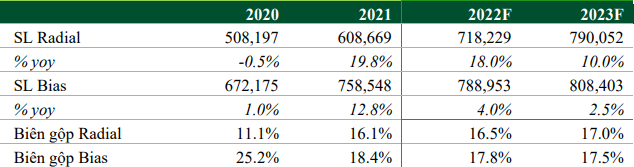 VCBS kỳ vọng DRC sẽ tiêu thụ 718,229 lốp radial trong năm 2022 (tăng 18% so với năm 2021) và 788,953 lốp bias chung (tăng 4%). Như vậy, doanh thu thuần 2022 của Công ty ước đạt 5,084 tỷ đồng, tăng 16.1%.