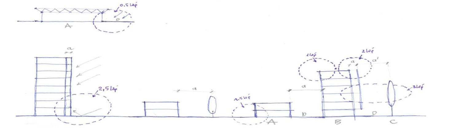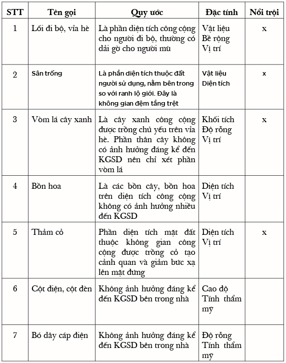 – Không gian phương ngang (KGPN) (hình 2b) là phần không gian công cộng từ mép đường đến mép nhô ra của công trình bao gồm các thành phần chi tiết như lối đi bộ, sân trống, vòm lá cây xanh, bồn hoa, thảm cỏ, cột đèn công cộng, bó dây cáp điện… Các thành phần chi tiết này gọi là các thành phần phương ngang (xem bảng 1). Có 3 trường hợp KGPN tùy theo khoảng cách từ mép đường đến mép công trình như sau: