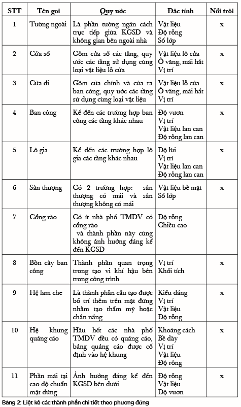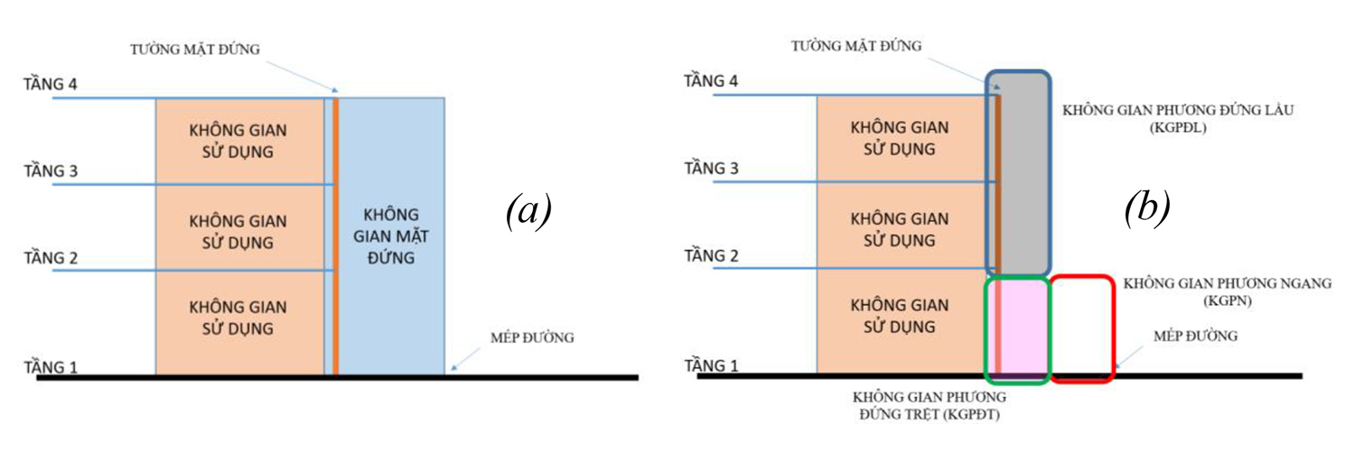 – Không gian phương đứng (KGPĐ) (hình 2b) là phần không gian tiếp nối giữa không gian sử dụng (trệt+lầu) và không gian phương ngang bao gồm các thành phần chi tiết như tường ngoài, cửa sổ, cửa đi, ban công, logia, sân thượng, cổng rào, bồn cây ban công, hệ lam che, khung quảng cáo, không gian trống, phần mái tại cao độ chuẩn mặt tiền… Các thành phần chi tiết này gọi là các thành phần phương đứng (xem bảng 2). Ngoài ra, KGPĐ là sự kết hợp giữa không gian phương đứng tầng trệt (KGPĐT) và không gian phương đứng tầng lầu (KGPĐL).