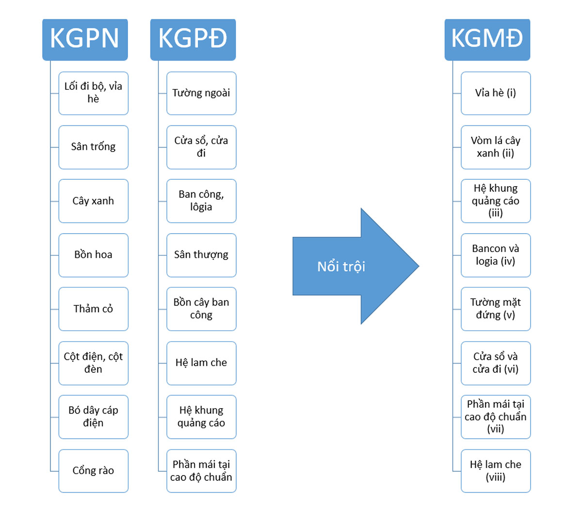 KGMĐ nhà phố bao gồm 2 không gian thành phần cơ bản là không gian phương ngang và không gian phương đứng (bài viết này chỉ xét trường hợp tường mặt đứng trùng với ranh lộ giới), trong đó: