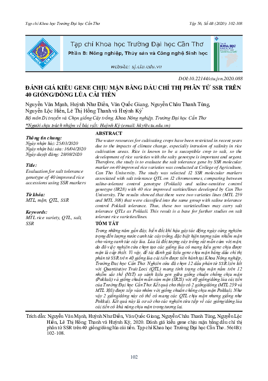 08.Trần Đình KhangdownloadDownload free PDFĐánh giá kiểu gene chịu mặn bằng dấu chỉ thị phân tử SSR trên 40 giống/dòng lúa cải tiến