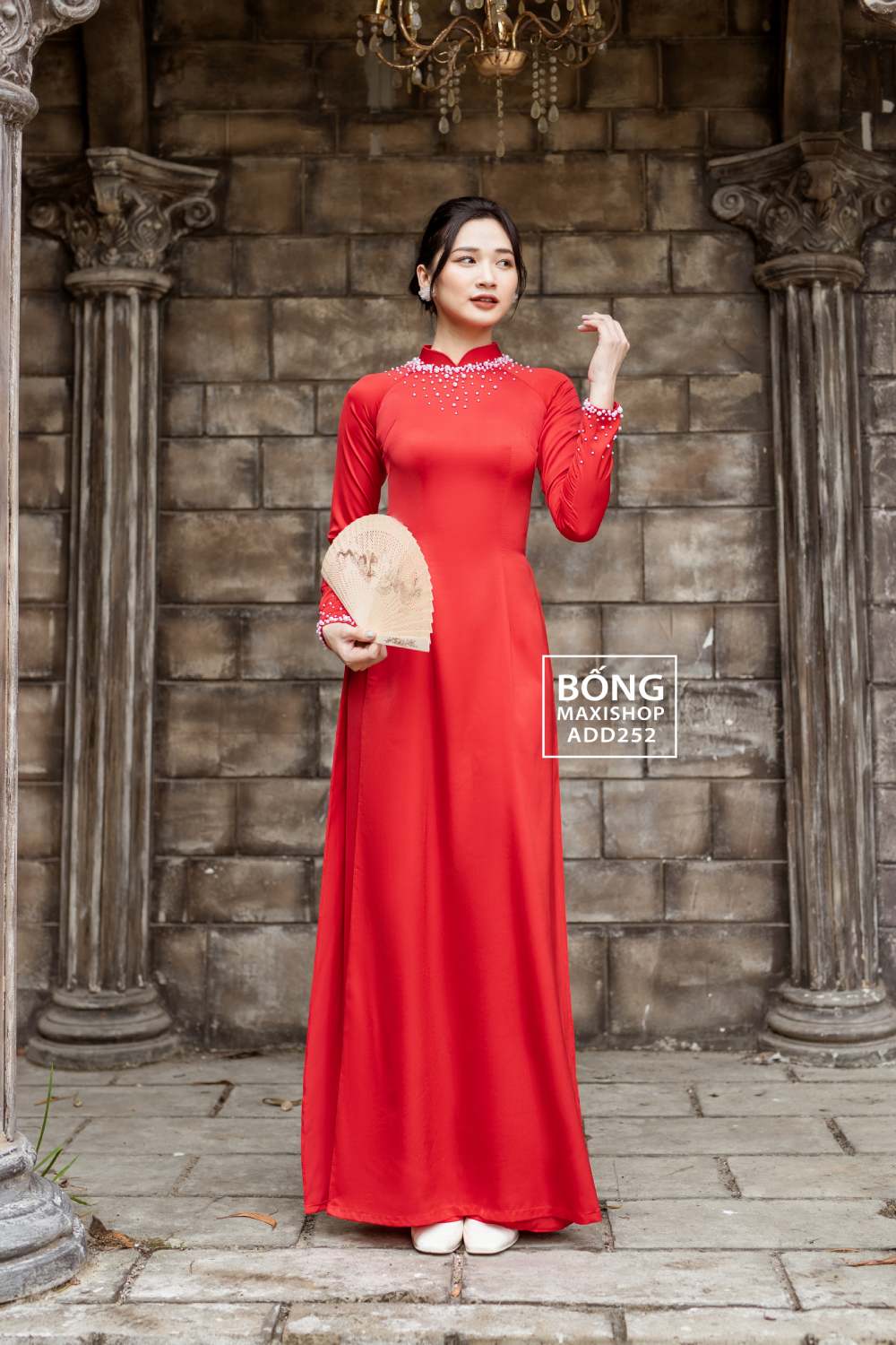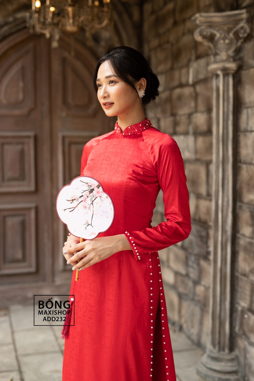 Áo dài cô dâu gấm đỏ 4 tà kết cườm cổ ADD232 mang vẻ đẹp đơn giản nhưng không kém phần quý phái. Chất liệu gấm mềm mịn, có độ bóng nhẹ. Chiếc áo dài được tỉ mỉ đính các viên ngọc nổi bật ở tay áo, viền tà áo và đặc biệt cổ áo được đính kín bởi những viên ngọc trai màu trắng và đỏ, tạo nên hiệu ứng rực rỡ tuyệt đẹp cho chiếc áo dài cô dâu, đặc biệt khi có ánh sáng chiếu vào. Diện chiếc áo dài này trong ngày trọng đại sẽ giúp nàng dâu tỏa sáng rực rỡ với vẻ đẹp tựa như một cô tiểu thư đài các thời xưa. Chiếc áo dài đám cưới này cũng rất thích hợp để chụp áo dài cưới ngoại cảnh mang nét cổ kính.