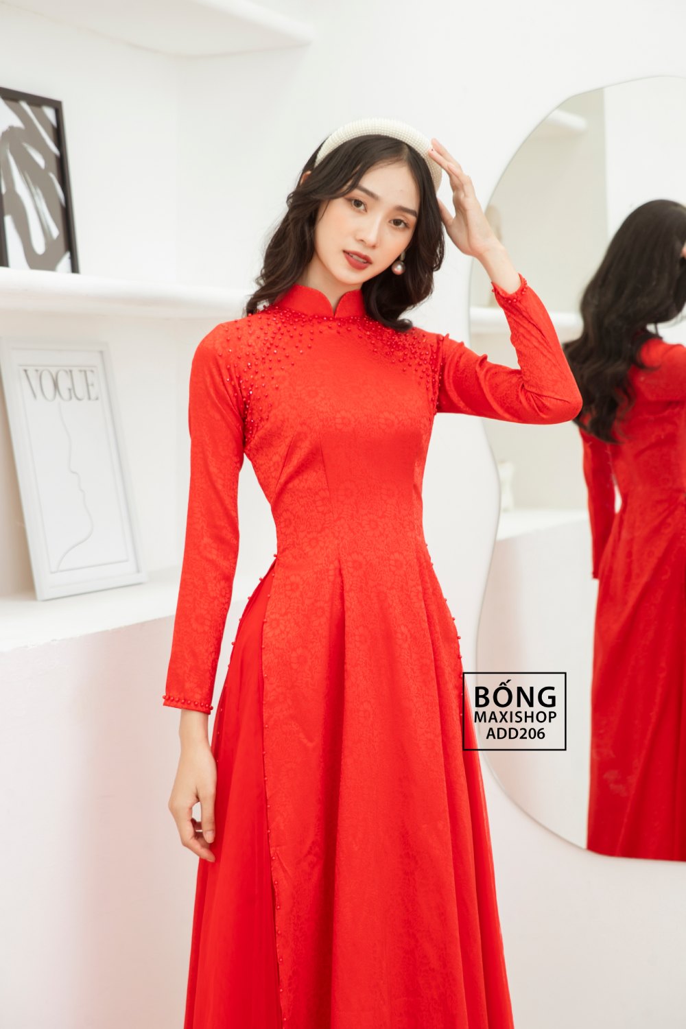 Mua ngay: Áo dài đám cưới lụa đỏ tươi kết hỷ ADD208