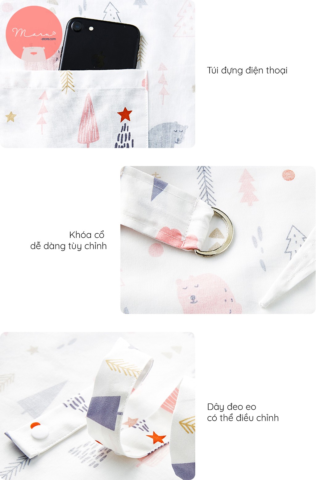 Chất liệu 100% cotton. Chất liệu xô thoáng mát, thấm hút mồ hôi. Chất liệu vải loại A, nhuộm hoạt tính, bé có nhai mẹ cũng không cần lo. Thiết kế của khăn đơn giản tinh tế: Phần dây choàng cổ có thể điều chỉnh phù hợp với chiều cao của mẹ & dễ dàng nhìn và quan sát bé bú; Phần dây eo có thể điều chỉnh, cố định đáp ứng nhiều nhu cầu. Bên trong có ngăn nhỏ bên trong để đựng vật nhỏ như điện thoại,… Khăn giặt máy vô tư, không biến dạng, không nổi lông, không xù, không rớt chỉ.