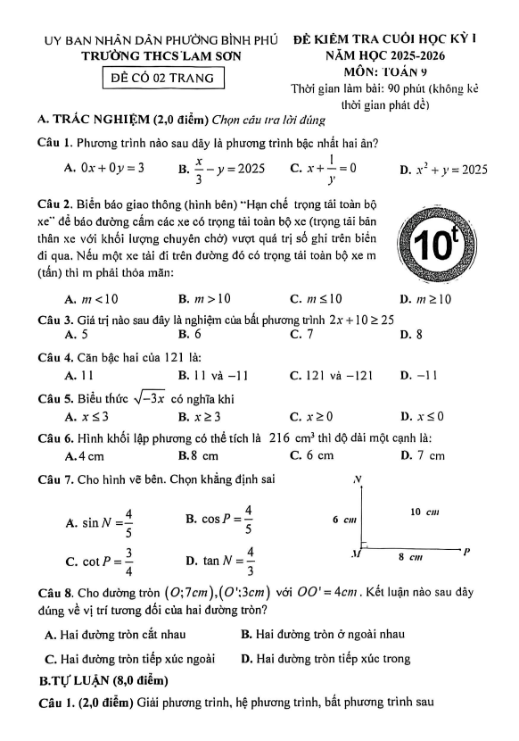 Đề cuối học kì 1 Toán 9 năm 2025 – 2026 trường THCS Tăng Nhơn Phú B – TP HCM 24/12/2025
