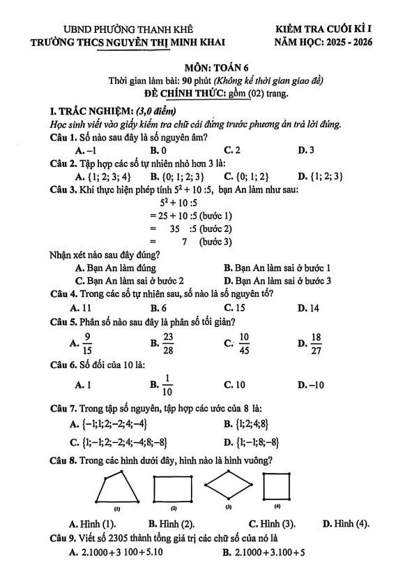 Đề cuối kì 1 Toán 8 năm 2025 – 2026 trường THCS Nguyễn Thị Minh Khai – Đà Nẵng 24/12/2025
