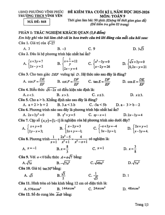 Đề cuối học kì 1 Toán 9 năm 2025 – 2026 trường THCS Đặng Tấn Tài – TP HCM 24/12/2025