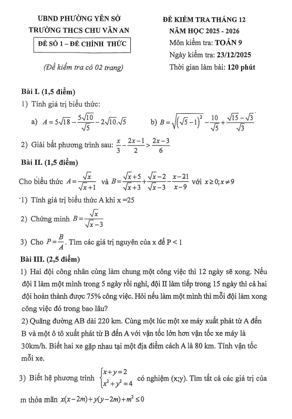 Khảo Sát Chất Lượng Toán 9 Đề khảo sát chất lượng Toán 9 năm 2025 – 2026 trường THCS Chu Văn An – Hà Nội