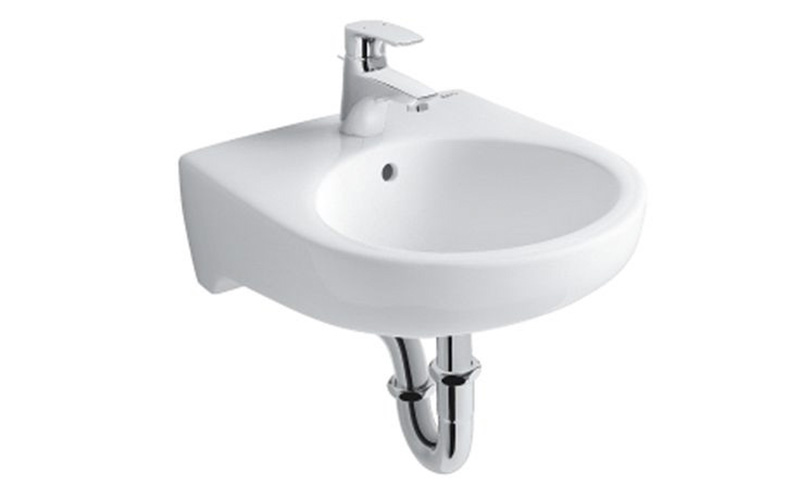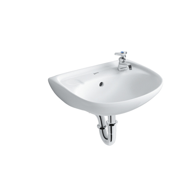 Đây là mẫu lavabo treo tường có lỗ vòi chậu chệch sang bên góc phải, tận dụng được rất nhiều không gian chính diện cho người dùng.