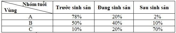 - Quần thể ở vùng B là quần thể ổn định với nhóm tuổi trước sinh sản và đang sinh sản chiếm tỉ lệ xấp xỉ nhau.