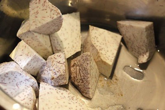– Gọt vỏ khoai môn, thái thành các miếng nhỏ vừa ăn như ngón tay út, rửa sạch rồi để ráo nước.